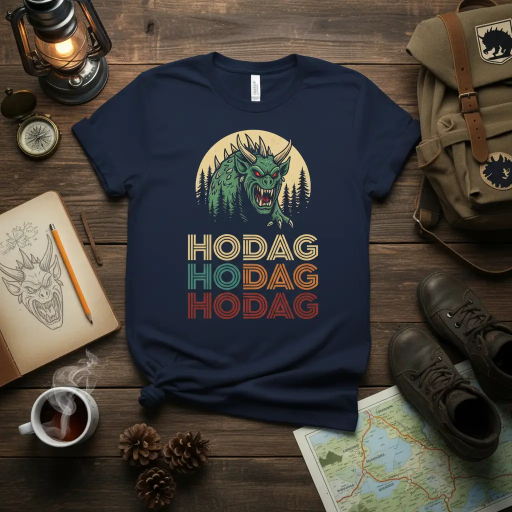 This striking t-shirt showcases the word “HODAG” repeated three times in a stylish, retro font and color scheme. Each line of text is presented in a different vibrant yet muted hue, creating a visually appealing contrast against the navy fabric. Above the text, a detailed illustration of the infamous Hodag monster stands out, complete with its fearsome horns, sharp claws, and piercing eyes.
