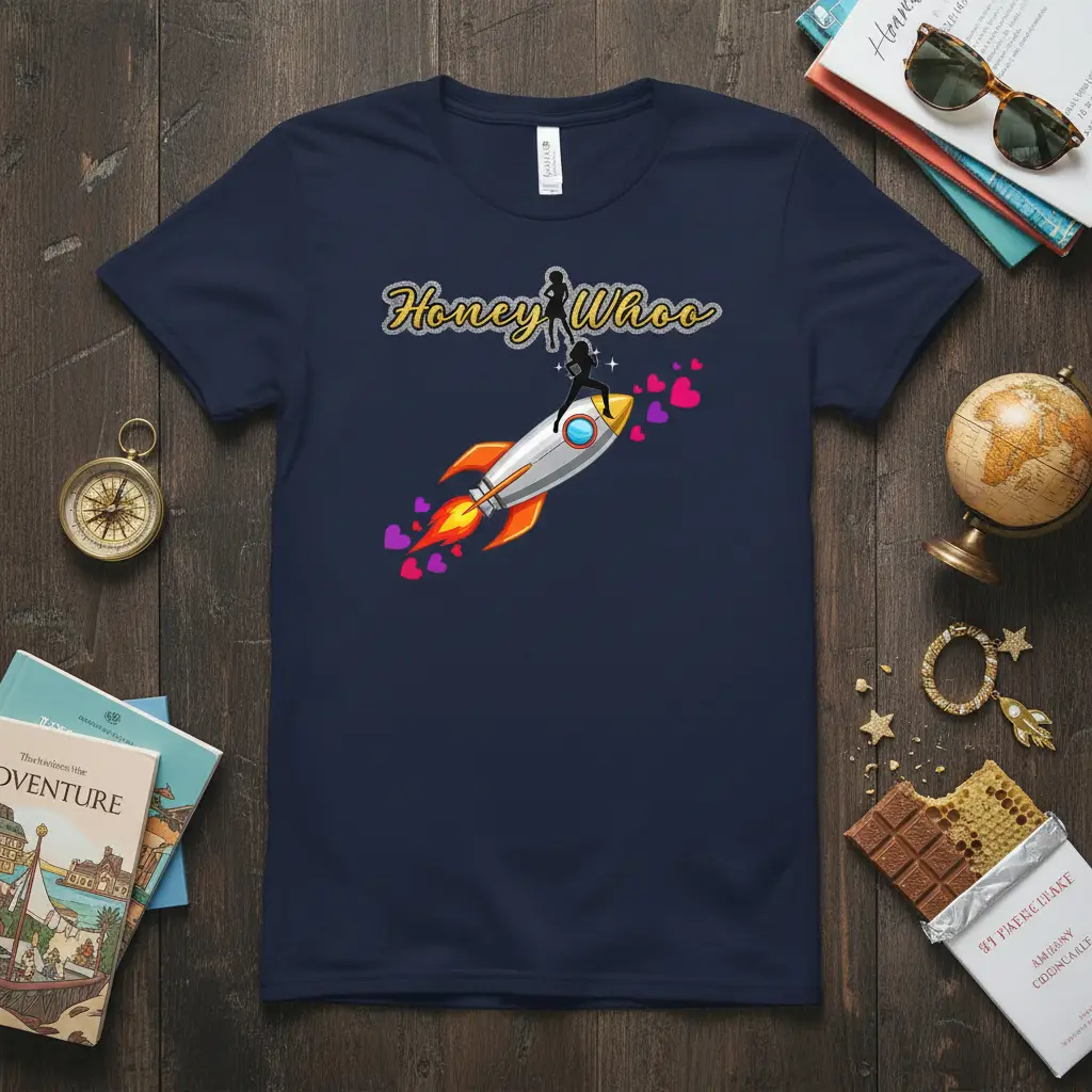 This captivating Honey Whoo design is printed on a premium quality t-shirt, ensuring both comfort and durability. You can choose from a selection of classic and versatile colors to best suit your style: Black, Red, Navy, White, Dark Heather, and Royal. These colors provide a fantastic backdrop for the vibrant rocket and heart graphic.