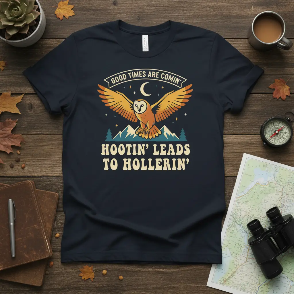 The phrase “Hootin’ Leads To Hollerin'” playfully suggests a chain reaction of good times, from quiet observation of nature to joyful exclamations of fun. It’s a motto for those who embrace life’s moments with enthusiasm and a spirit of camaraderie. The owl, often a symbol of wisdom and mystery, here represents the anticipation and excitement of upcoming positive experiences.