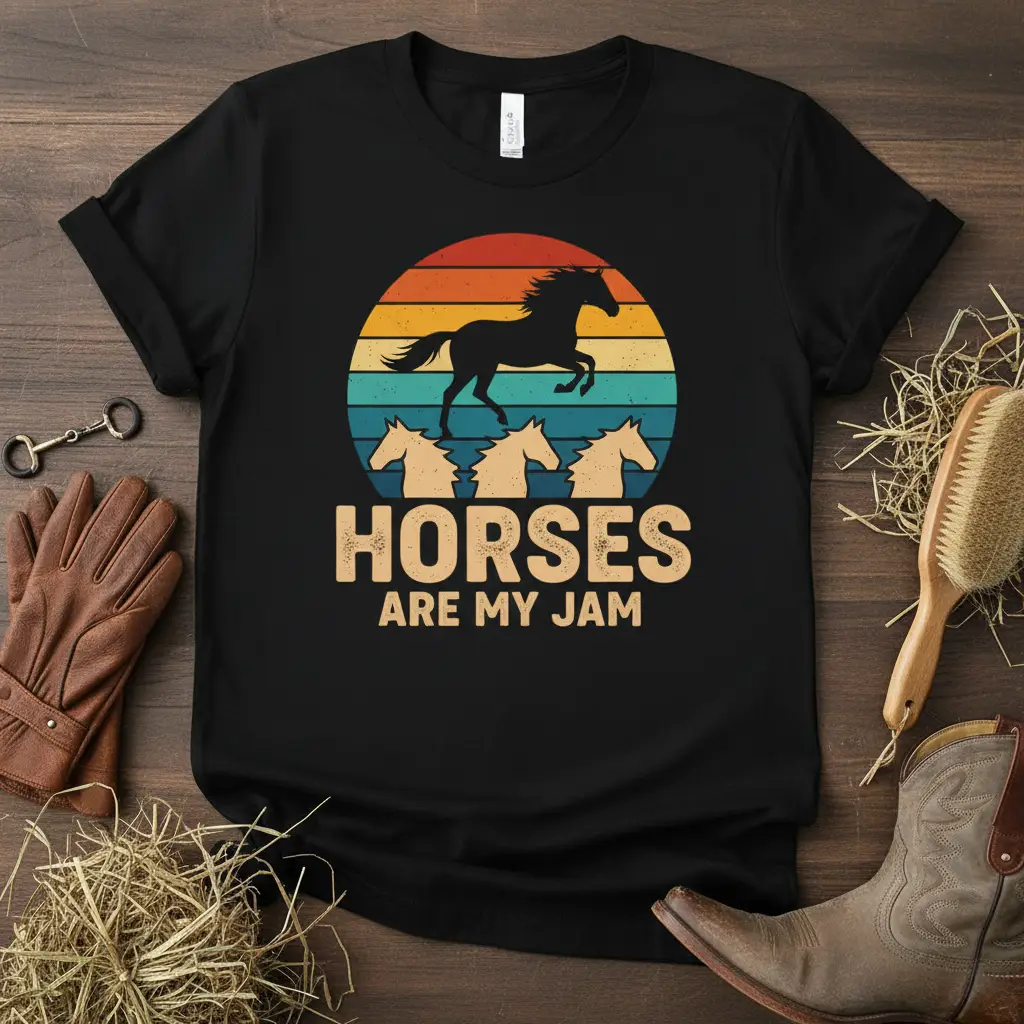 The “HORSES ARE MY JAM” t-shirt is an essential addition to the wardrobe of any true horse lover. Its unique blend of retro style, bold typography, and artistic graphics makes it stand out. This shirt allows you to wear your heart on your sleeve, quite literally, and share your passion with the world. It’s a symbol of your dedication and love for these incredible animals, making it a cherished item for years to come.