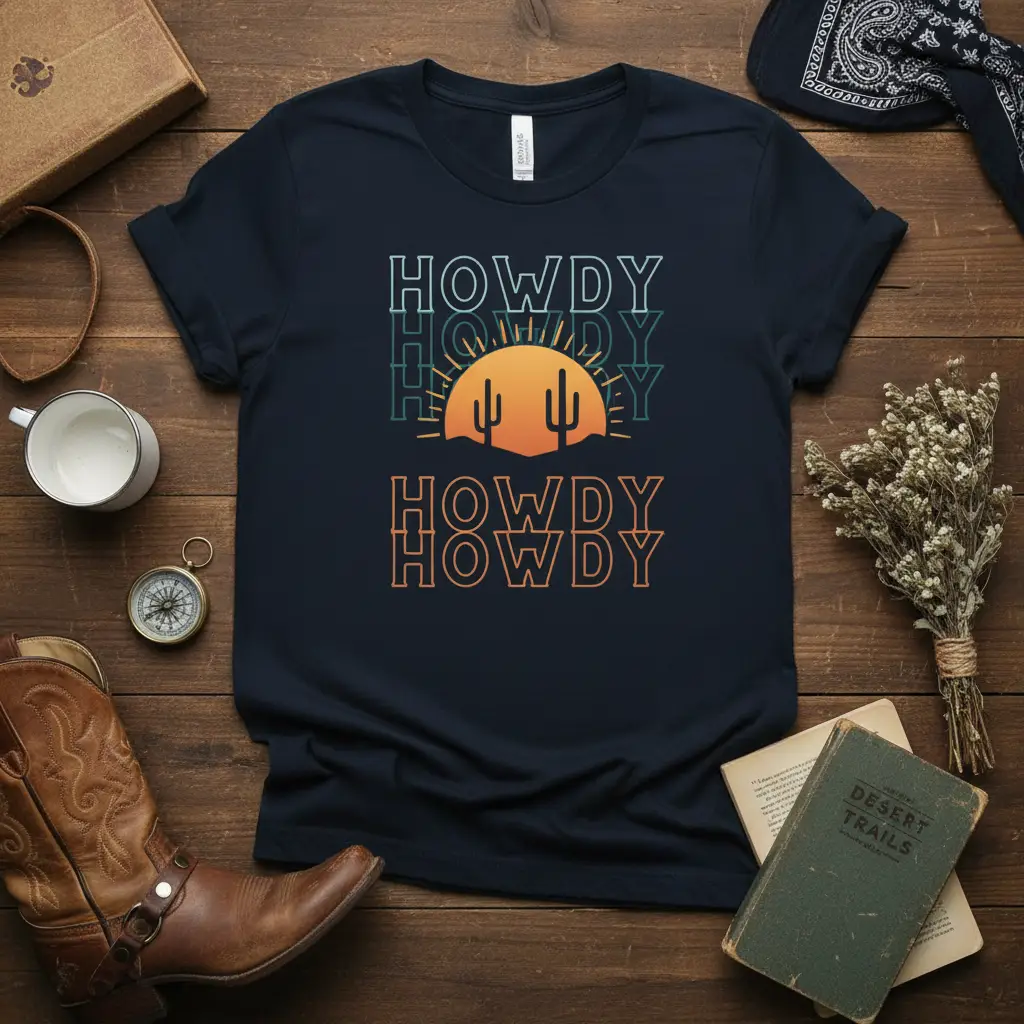 To complement your personal style, this Howdy Howdy Howdy Howdy Howdy t-shirt is available in several classic colors. Select from timeless Black, deep Navy, vibrant Red, clean White, subtle Dark Heather, or striking Royal blue. Each color option enhances the unique desert sunset graphic, allowing you to pick the hue that best represents your individual taste and personality.