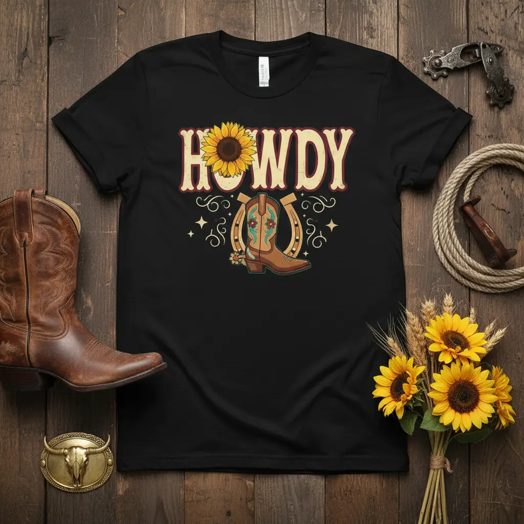 This unique t-shirt design brings together iconic western imagery to create a statement piece that’s both stylish and expressive. The word “Howdy” is rendered in a retro-inspired font, complemented by a vibrant sunflower that adds a touch of natural beauty and warmth. Below, a detailed cowboy boot and horseshoe graphic complete the ensemble, symbolizing adventure and good luck.