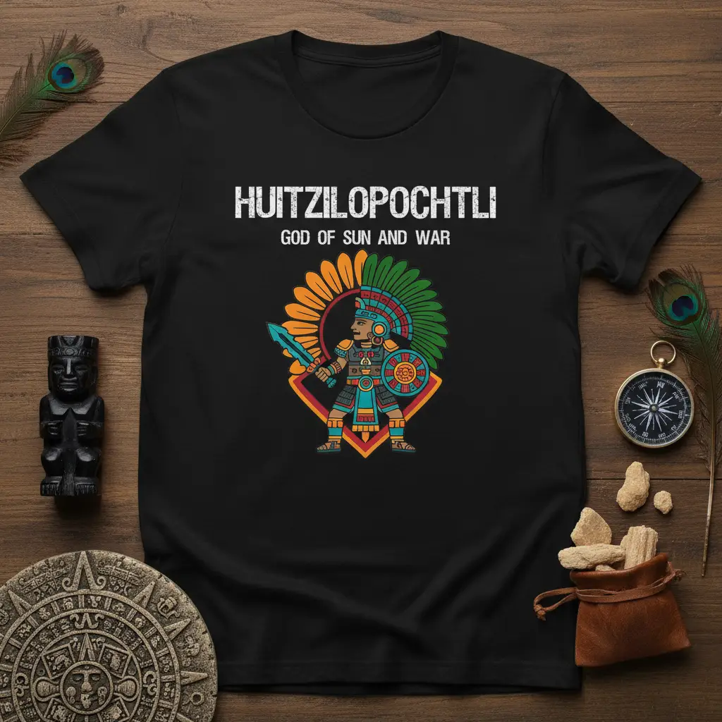 The bold typography of “HUITZILOPOCHTLI” paired with “GOD OF SUN AND WAR” clearly communicates the shirt’s theme. The overall aesthetic is both commanding and visually appealing, making it a standout piece in any casual wardrobe. This Huitzilopochtli God of Sun and War design honors a deity central to Aztec cosmology and warfare, making it a meaningful garment for those who value historical and cultural expression.