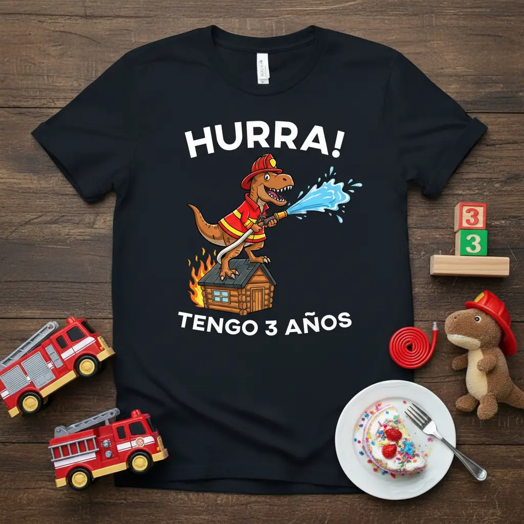 Hurra Tengo 3 Años Dinosaur Firefighter Birthday Shirt