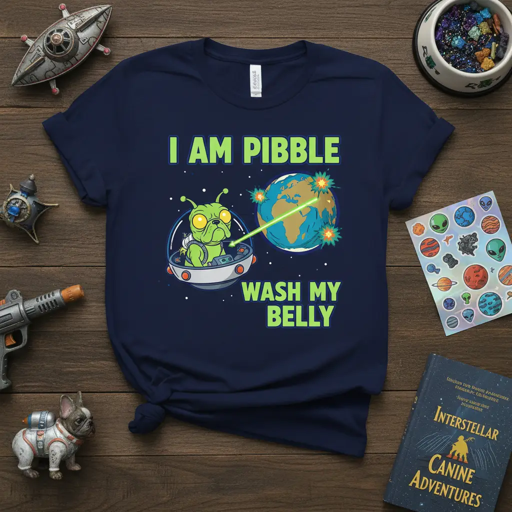 This eye-catching design features a vibrant depiction of an alien pug in a spaceship, playfully aiming a laser at the Earth. The accompanying text, “I AM PIBBLE WASH MY BELLY,” adds a layer of humor and personality that resonates with dog lovers everywhere. It perfectly encapsulates the quirky, sometimes demanding, but always lovable nature of our canine friends.