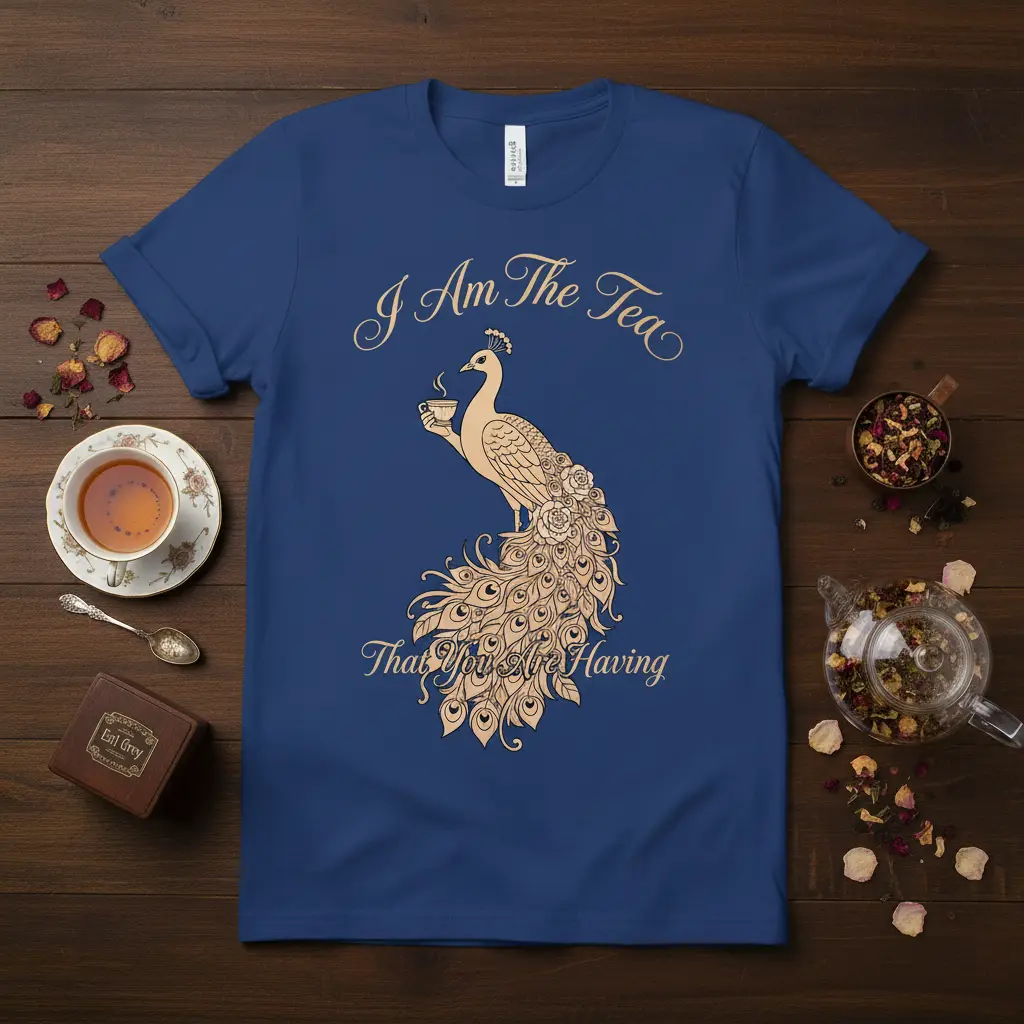 I Am The Tea That You Are Having, this captivating phrase adorns a t-shirt designed for those who truly appreciate the art of tea. The intricate design features a majestic peacock, elegantly holding a steaming cup of tea, surrounded by ornate floral details. It’s more than just apparel; it’s a statement piece for the discerning tea lover, blending sophistication with a touch of whimsy. This tee is crafted for comfort and style, making it the perfect companion for your quiet moments of reflection or lively discussions over a warm brew.