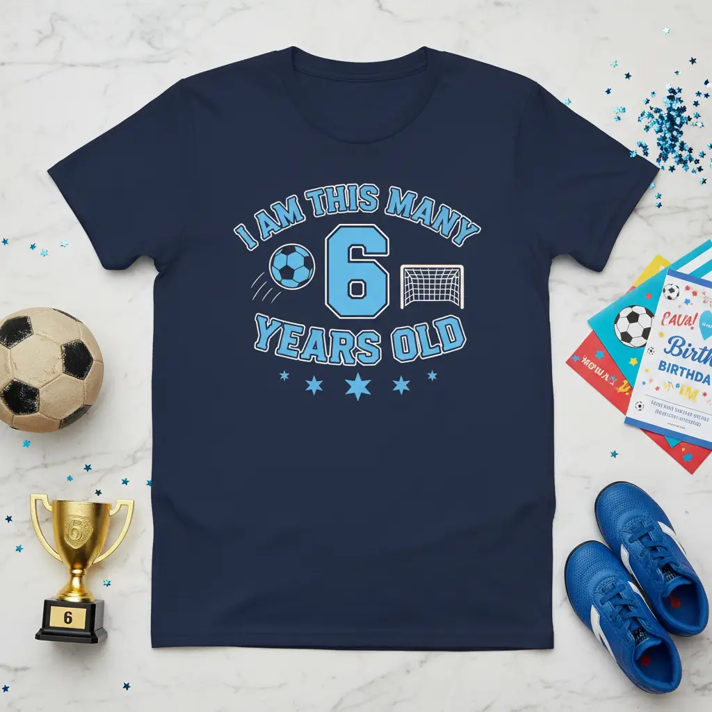 I AM THIS MANY 6 YEARS OLD, this vibrant t-shirt is designed to make any six-year-old feel like a true soccer star on their special day. Perfect for birthday parties, school events, or everyday wear, this tee combines comfort with a fun, sporty design. It’s a fantastic way for kids to express their age and their love for the beautiful game. Celebrate this exciting milestone with a shirt that scores big on style and fun.