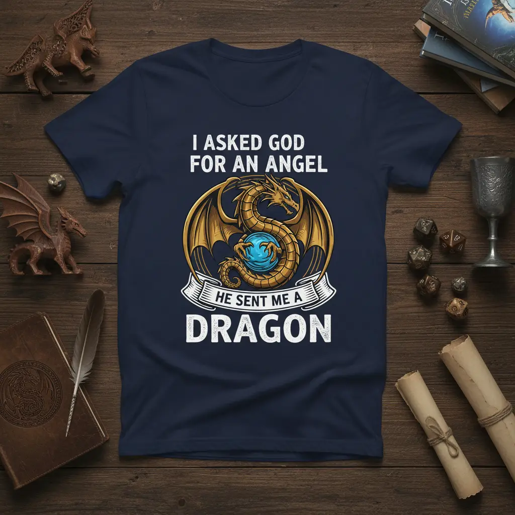 I ASKED GOD FOR AN ANGEL HE SENT ME A DRAGON. This powerful statement tee captures the essence of admiration for mythical beasts, transforming a beloved quote into wearable art. It’s designed for those who find beauty and strength in the legendary dragon, seeing it not just as a creature of fantasy, but as a symbol of protection and awe. This shirt is more than just apparel; it’s a declaration of affinity for the fantastical and the majestic. Wear it proudly and let your passion for dragons shine.