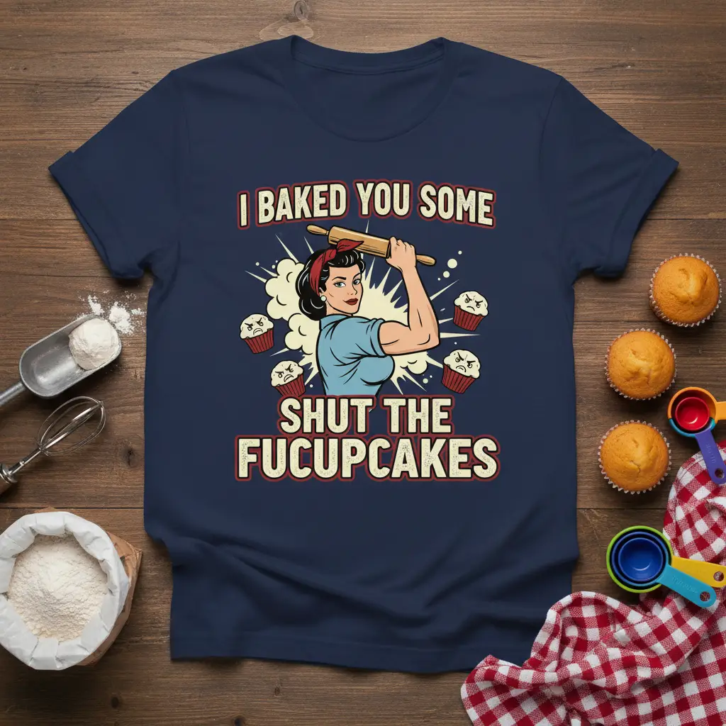 I Baked You Some Shut The Fucupcakes is more than just a catchy phrase; it’s a declaration for anyone who spends time in the kitchen creating delicious treats. This t-shirt captures the spirit of baking with a humorous twist, making it a must-have for passionate home bakers, professional chefs, or anyone who simply enjoys a good laugh. The design is a playful nod to the effort and love that goes into every batch of baked goods, often met with unexpected reactions.