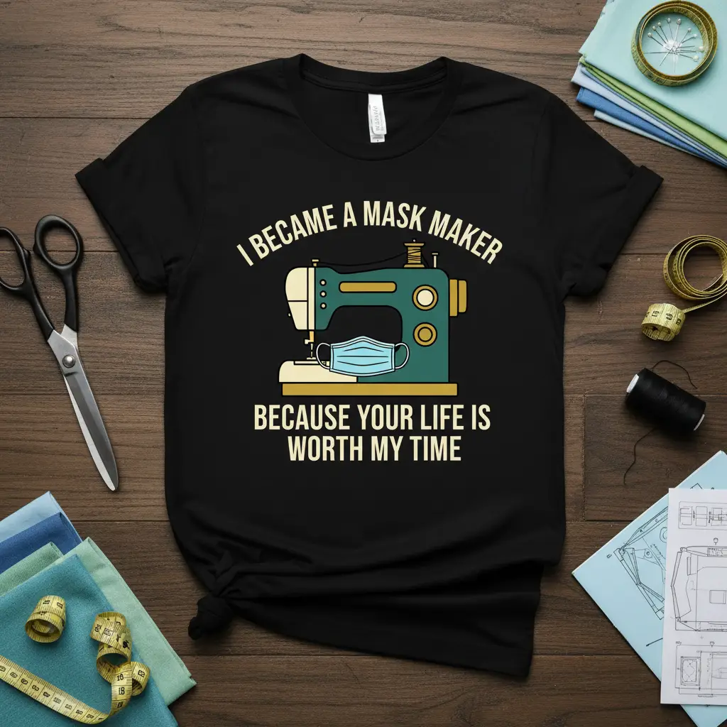 I BECAME A MASK MAKER BECAUSE YOUR LIFE IS WORTH MY TIME. This sentiment beautifully captures the dedication and altruism of individuals who turned their crafting skills towards creating essential face coverings. The design features a classic sewing machine, a symbol of creation and perseverance, adorned with a protective mask. It’s a powerful tribute to the seamstresses, quilters, and DIY enthusiasts who contributed their time and talent when it mattered most. Wearing this shirt is a way to acknowledge their invaluable contribution and express gratitude for their efforts.