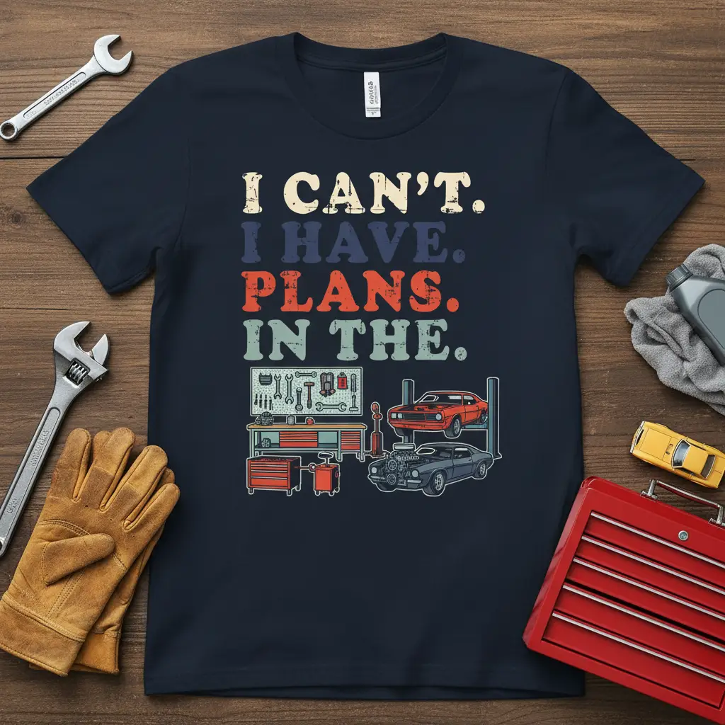 I Can’t I Have Plans In The statement tee is the ultimate declaration for anyone whose heart belongs in the garage. This design speaks volumes to the dedicated car enthusiast, the meticulous mechanic, and the passionate automotive hobbyist. It humorously captures the reality that for many, time spent tinkering with engines and restoring classic rides takes precedence over other engagements. The retro-inspired graphic and typography evoke a sense of nostalgia and appreciation for the timeless craft of auto repair.