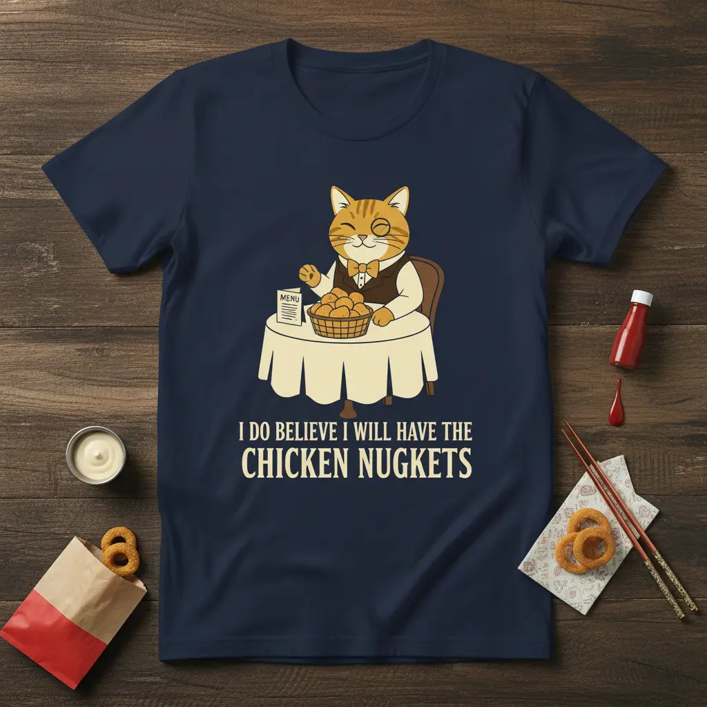 I DO BELIEVE I WILL HAVE THE CHICKEN NUGKETS is more than just a phrase; it’s a declaration of delicious intent for anyone who truly appreciates the crispy, golden perfection of chicken nuggets. This t-shirt captures that sentiment with a whimsical design featuring a dapper cat, impeccably dressed and seated at a table, ready to place its order. It’s the perfect way to express your love for this universally adored snack and your affinity for feline charm. Whether you’re a devoted foodie, a cat enthusiast, or simply someone who enjoys a good laugh, this tee is designed to bring joy and spark conversations.