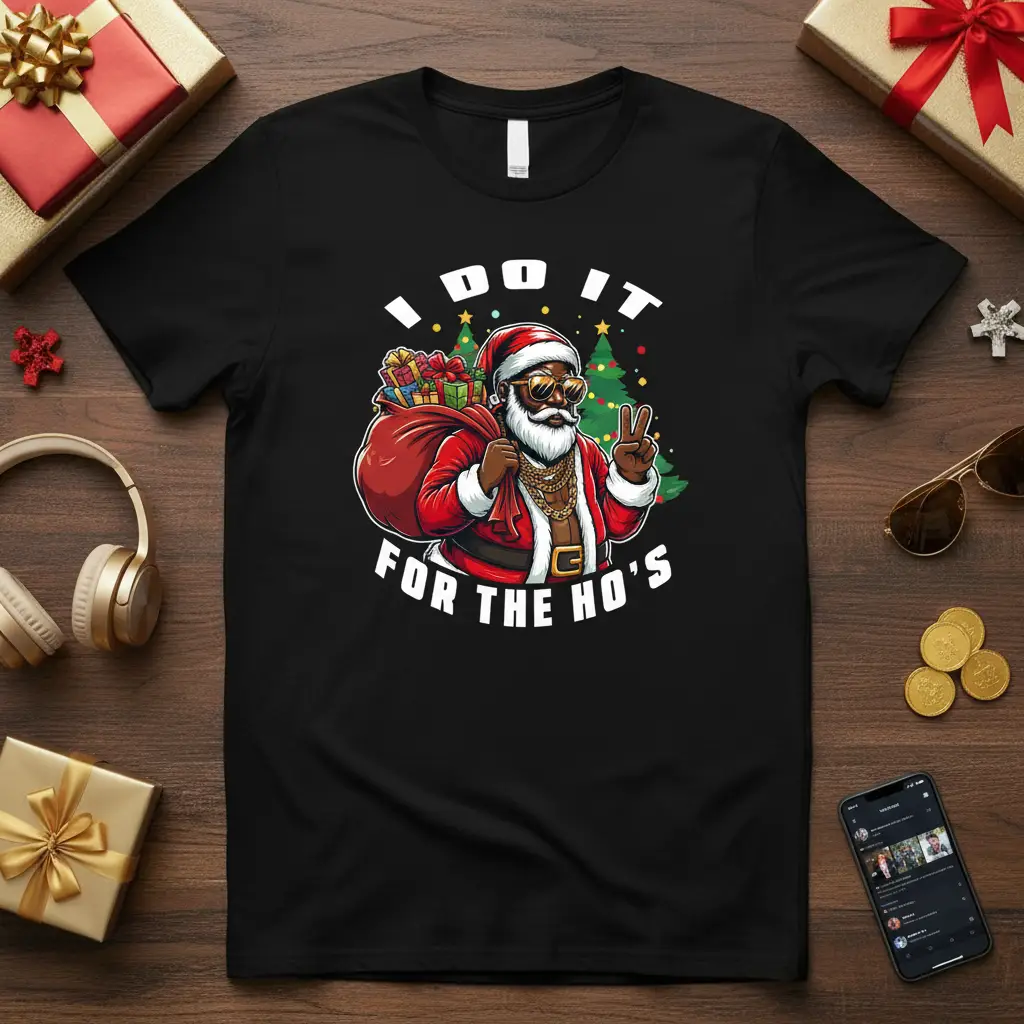 I Do It For The Ho’s, this holiday season, express your festive spirit with a touch of playful humor. This unique t-shirt captures the essence of Christmas cheer with a design that’s sure to turn heads and spark conversations. It’s the perfect way to stand out at any holiday party or casual get-together. Embrace the fun and spread some laughter with this unforgettable piece of festive apparel.