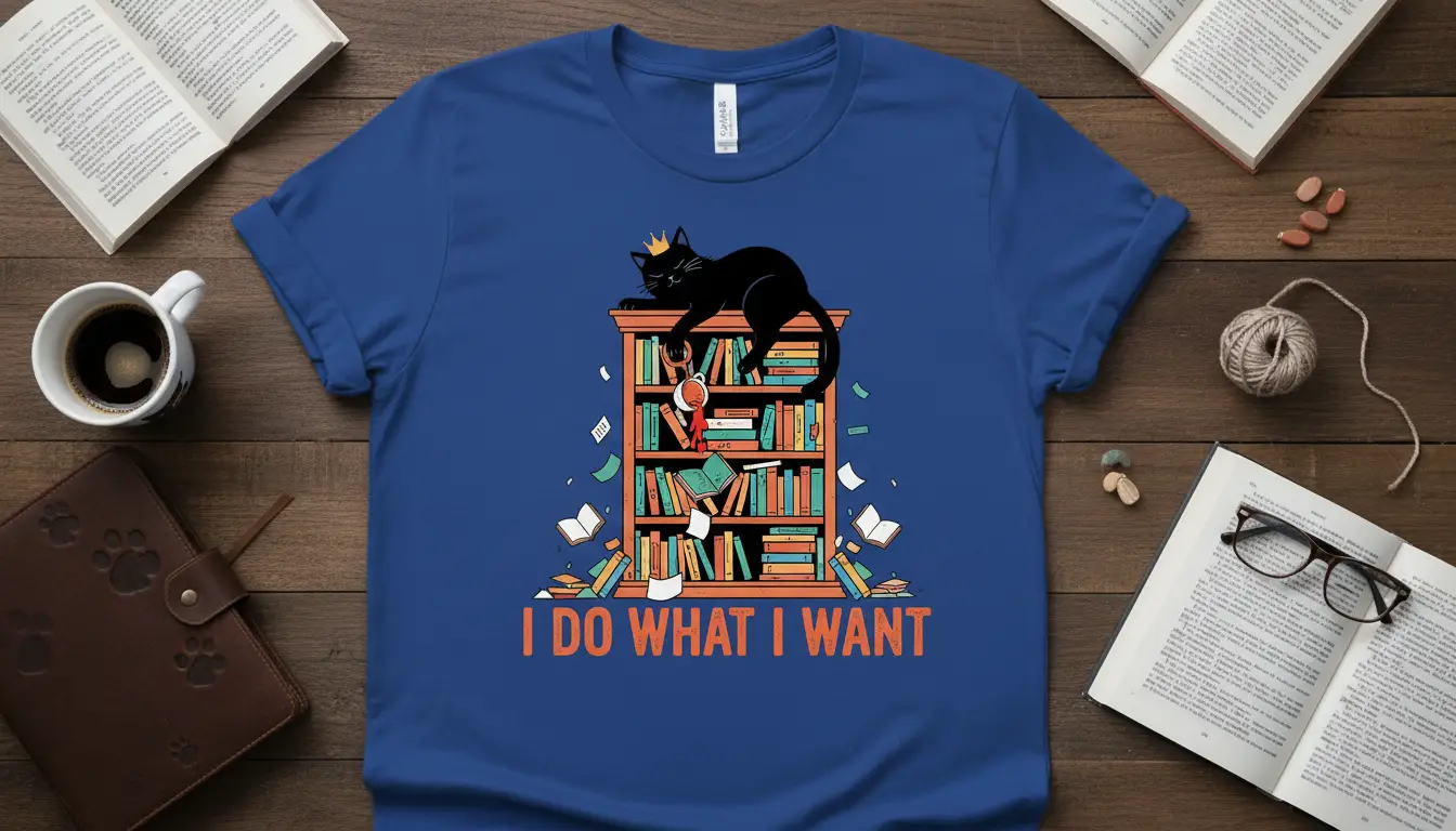 I DO WHAT I WANT emblazoned on this unique t-shirt captures the essence of independent spirit and playful rebellion. This eye-catching design features a regal black cat perched atop a chaotic yet charming bookshelf, surrounded by scattered books and fluttering papers. It’s the perfect way for cat lovers, bookworms, and anyone who marches to the beat of their own drum to express their personality. The vibrant orange text pops against the royal blue fabric, making a bold statement that’s both humorous and relatable. This tee is more than just clothing; it’s a declaration of freedom and a nod to the simple joys of a good book and a cat’s company.