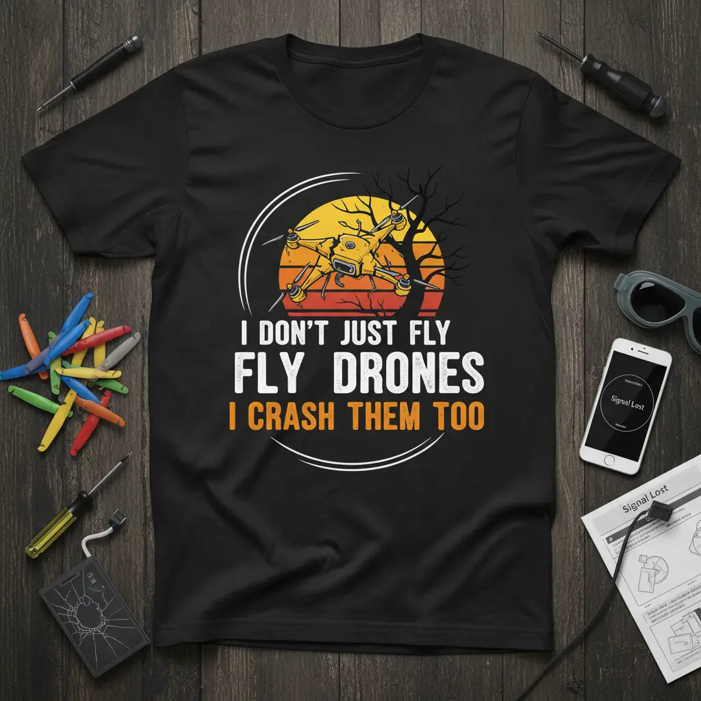 This unique t-shirt speaks directly to the heart of the drone community. It acknowledges that while flying drones is an incredible skill and passion, sometimes things don’t go exactly as planned. The design features bold typography that clearly communicates the message, complemented by a striking graphic of a drone set against a sunset backdrop. It’s a conversation starter and a way to connect with fellow pilots who share similar experiences.