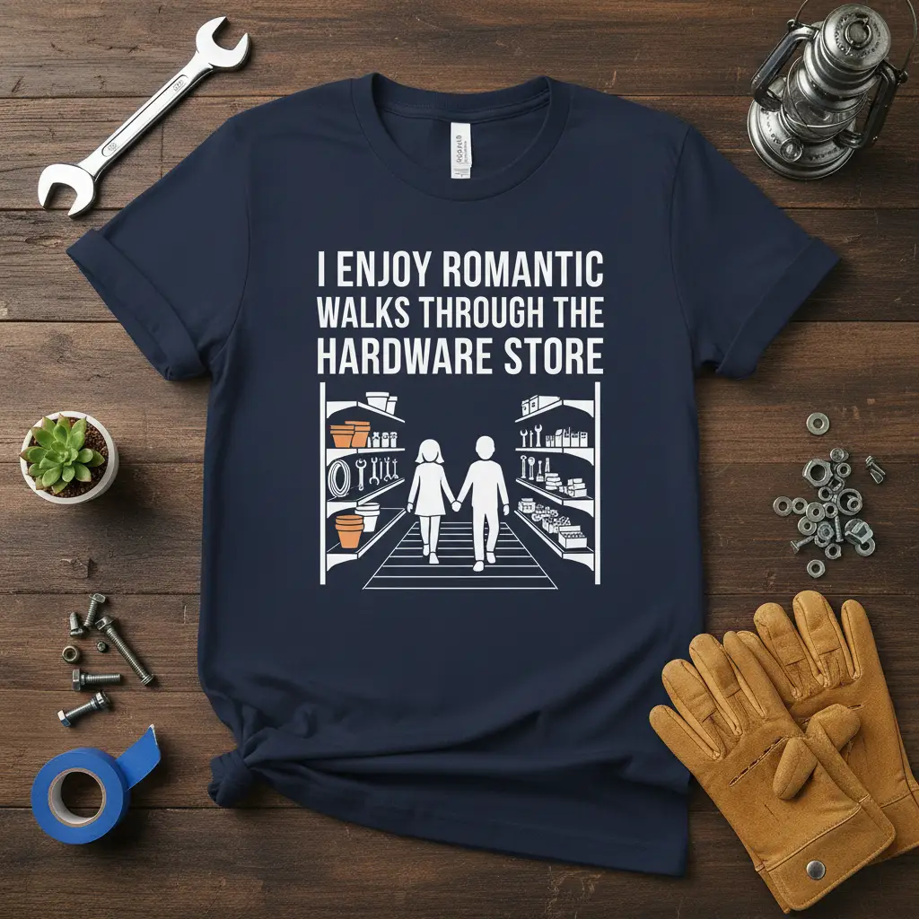 Don’t miss out on the chance to own this distinctive “I Enjoy Romantic Walks Through The Hardware Store” T-Shirt. It’s the perfect way to showcase your unique sense of humor and your love for all things DIY and home improvement. Whether it’s a treat for yourself or a gift for a loved one, this tee is sure to bring smiles and spark conversations. Add this must-have shirt to your collection and wear your passion with pride!