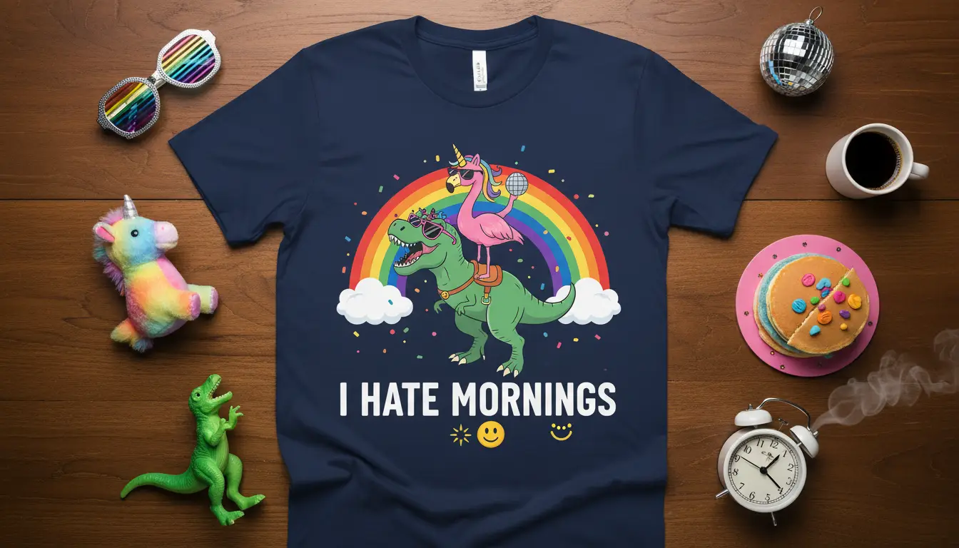 The combination of a T-Rex and a flamingo unicorn under a rainbow creates an unforgettable image. This whimsical pairing perfectly encapsulates the often-chaotic feelings associated with waking up when you’d rather be dreaming. It’s a design that resonates with a wide audience, from dinosaur enthusiasts to lovers of all things magical and quirky.