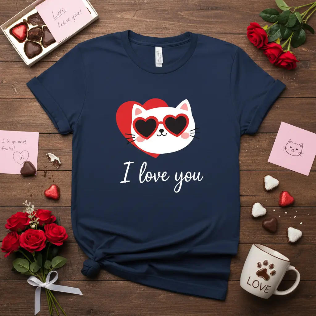 Show your love with this adorable “I love you” cat t-shirt, perfect for Valentine’s Day or any occasion. The cute design features a cat wearing heart-shaped sunglasses, making it a purrfect gift for any cat lover. This comfortable tee is sure to bring a smile to their face.