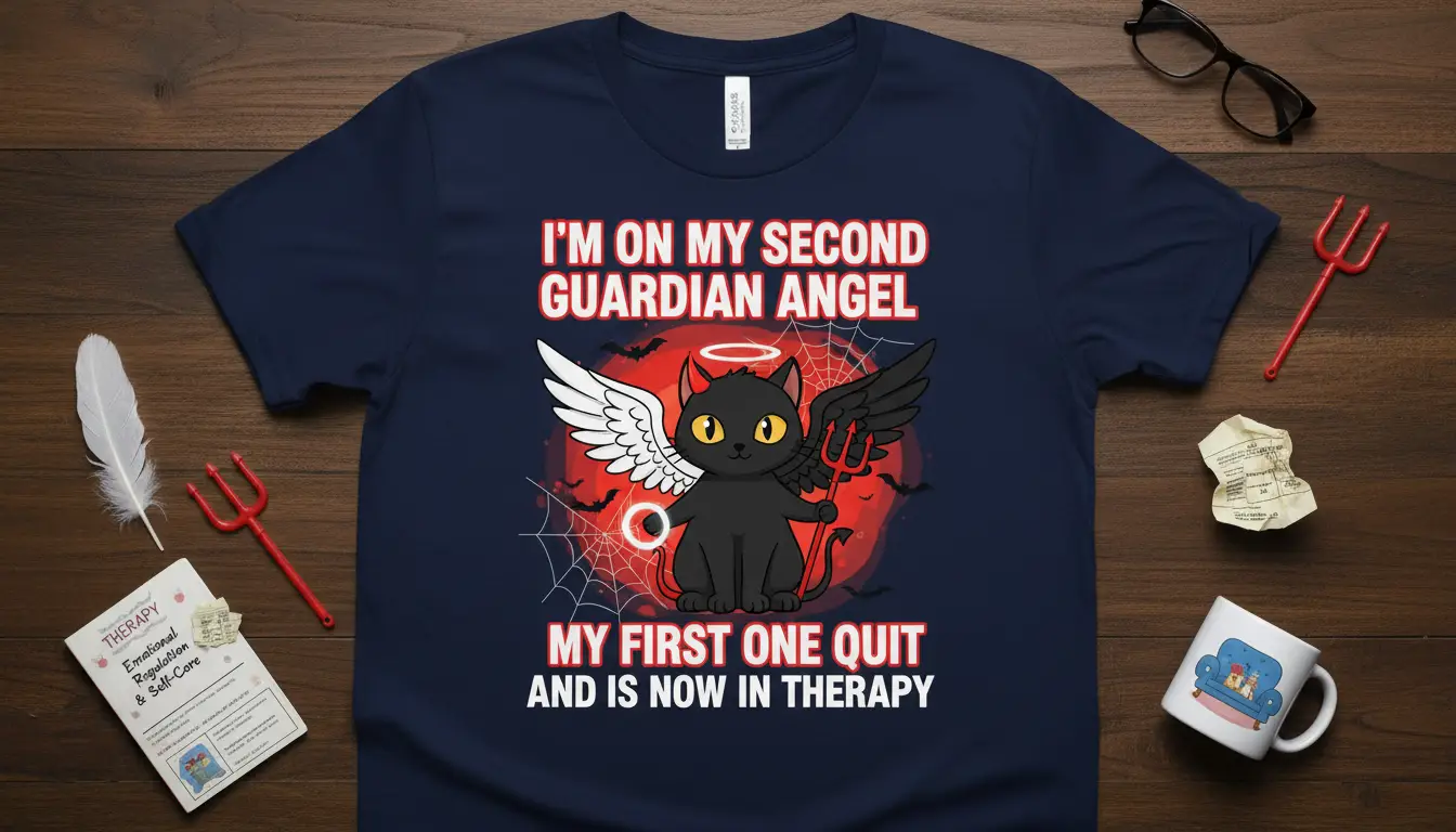 I’m on my second guardian angel my first one quit and is now in therapy. This statement tee captures a relatable and humorous sentiment with a playful, edgy design. It’s perfect for anyone who appreciates witty humor, loves cats, or understands the journey of self-care and seeking help. The design features a charming black cat sporting both angelic and devilish wings, a halo, and a pitchfork, embodying the cheeky spirit of the quote.