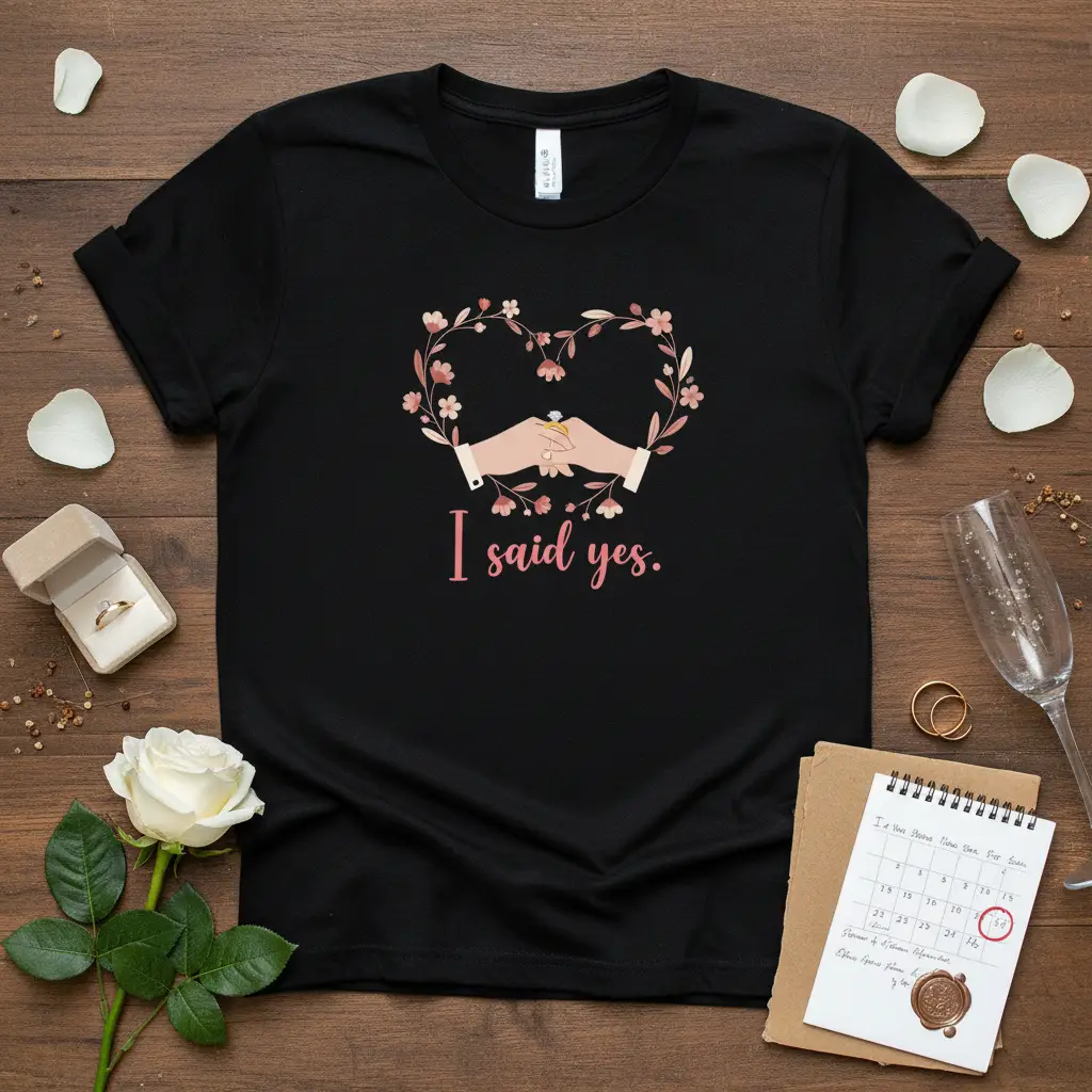 I said yes. This t-shirt is more than just apparel; it’s a declaration of love, commitment, and the exciting start of a new chapter. Designed for the radiant bride-to-be, it captures the magical moment of a proposal and the joyful affirmation that follows. The beautiful graphic, featuring intertwined hands showcasing a sparkling engagement ring within a delicate floral heart, speaks volumes of romance and anticipation. It’s the perfect way to announce your engagement, celebrate your journey, or simply wear your happiness with pride. This tee is a must-have for any woman embarking on her path to matrimony, offering comfort and style as she relishes this special time.