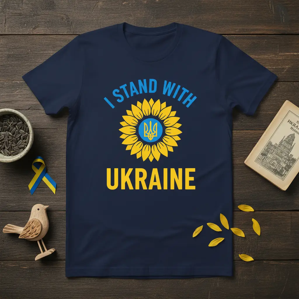 I Stand With Ukraine with this powerful and meaningful t-shirt, designed to show solidarity and support for the people of Ukraine. The striking graphic features a vibrant sunflower, a symbol of peace and resilience, centered with the Ukrainian trident. This tee is more than just apparel; it’s a statement of unity, a visual representation of hope, and a way to connect with a global community standing together. Wear it proudly to raise awareness and express your unwavering backing for Ukraine during these challenging times.