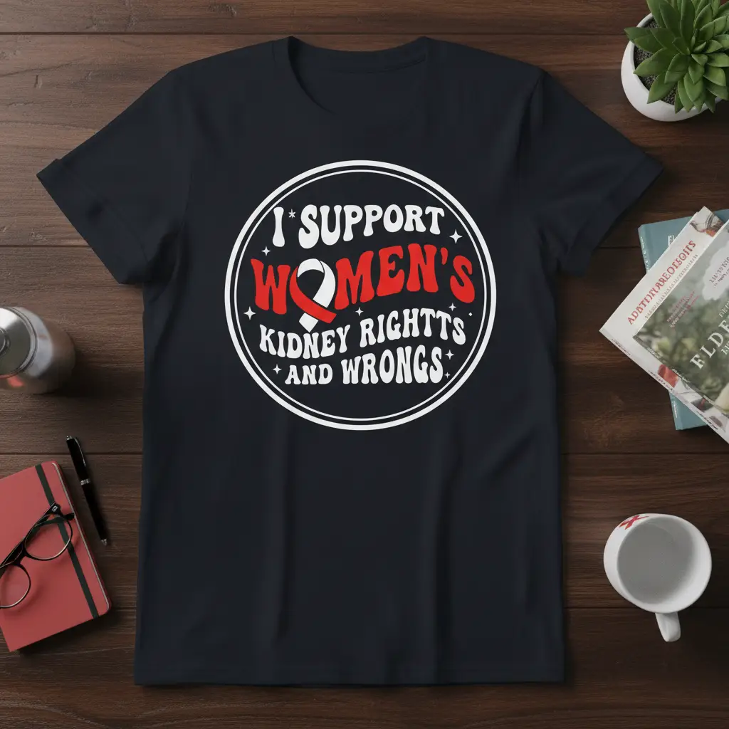 This impactful design serves as a powerful emblem for anyone passionate about women’s health and kidney advocacy. The bold typography and the symbolic red ribbon clearly communicate a message of support and awareness. It’s designed for individuals who want to stand up and be counted, making their voices heard on issues that affect women’s well-being and access to care. Wearing this t-shirt is a visible act of solidarity, fostering community among supporters and educating those around you.