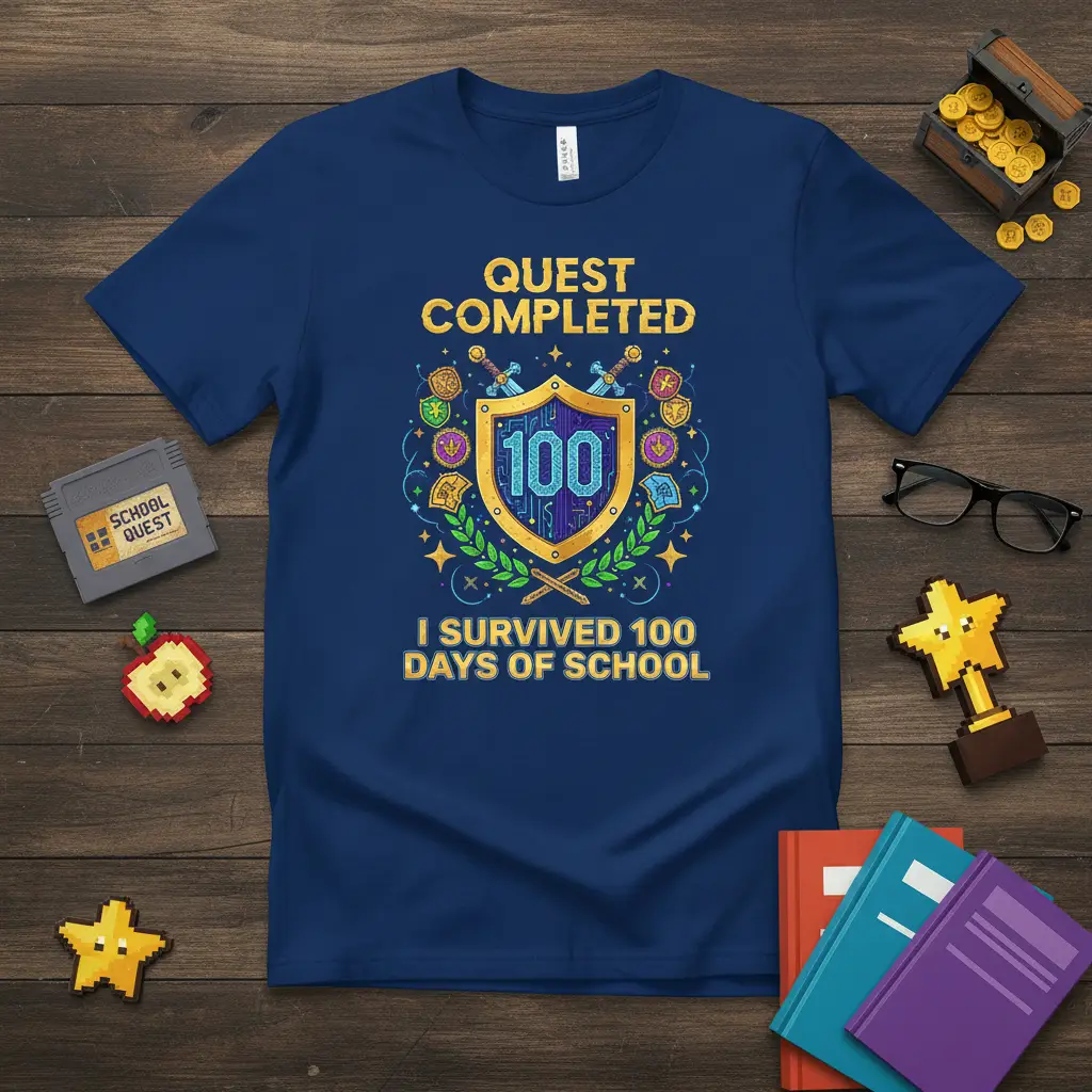Wearing this shirt is a fun and proud way to acknowledge the learning, growth, and challenges overcome. It serves as a tangible reminder of the progress made and the exciting educational path ahead. This I SURVIVED 100 DAYS OF SCHOOL design is both eye-catching and meaningful, resonating with the gamer-inspired theme that makes achieving educational goals feel like a true quest.