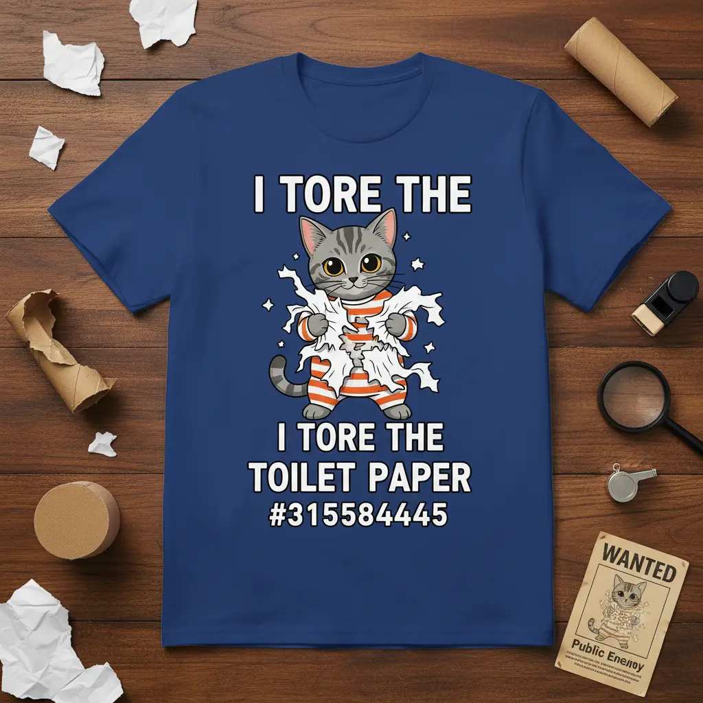 This eye-catching design features a charmingly mischievous cat, playfully entangled in shredded toilet paper. The bold typography clearly states the humorous “I Tore The Toilet Paper” phrase, instantly recognizable to anyone who has shared their home with a cat. It’s a testament to the unpredictable and often comical nature of our furry friends, making it a must-have for any cat enthusiast’s wardrobe. The design’s humor lies in its simple, direct message that resonates with the daily realities of cat ownership.