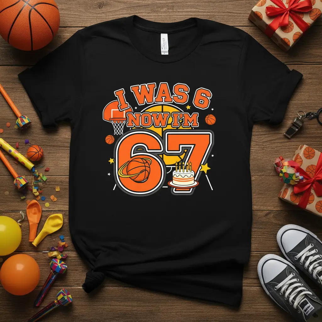 I WAS 6 NOW I’M 67 design celebrates a special birthday milestone with a sporty twist. This unique t-shirt is perfect for anyone hitting the big 6-7 and looking to show off their love for the game. It combines the excitement of a birthday with the passion for basketball, making it an unforgettable gift or personal treat. The vibrant design ensures you’ll stand out on your special day.