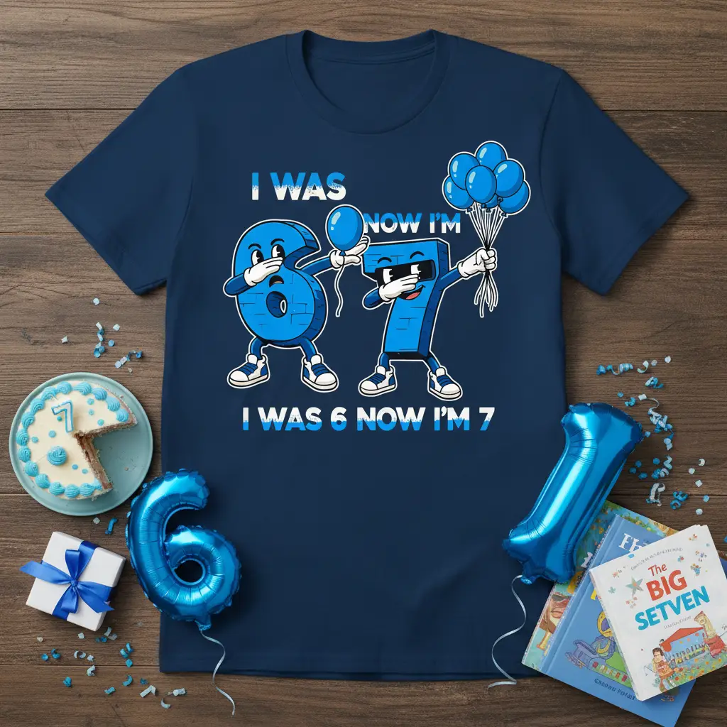 This eye-catching “I Was 6 Now I’m 7” t-shirt is the ultimate apparel for any child who is about to celebrate their seventh birthday. The design features two animated numbers, a ‘6’ and a ‘7’, doing the popular dab dance while holding a bunch of bright blue balloons. This visual representation of aging up is both humorous and celebratory, making it a fantastic conversation starter at any party. It’s a fun and engaging way for kids to express their excitement about reaching this significant age milestone.