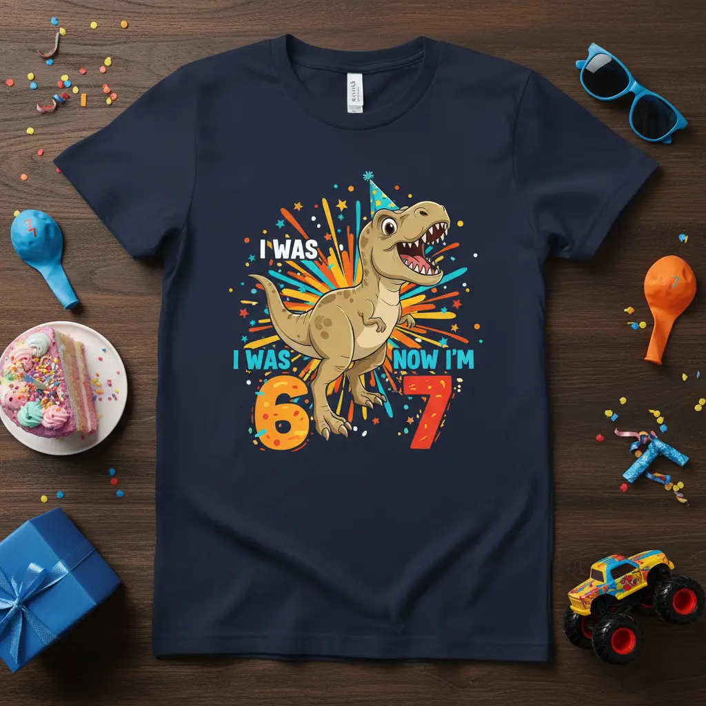 I Was 6 Now I’m 7! Get ready for a prehistoric party with this awesome dinosaur-themed birthday t-shirt designed for the coolest seven-year-old around. This vibrant tee captures the excitement of turning seven with a fierce T-Rex graphic, complete with a festive party hat and a shower of colorful fireworks. It’s the perfect way for any little dino enthusiast to celebrate their special day in roaring style. Made for comfort and built for adventure, this shirt is sure to be a hit at any birthday celebration.