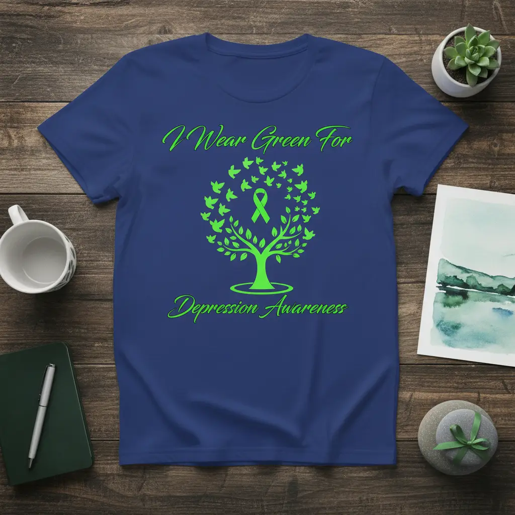 Pick from Black, Navy, Royal, Dark Heather, Red, and White to match your mood and wardrobe staples. Each colorway keeps the I Wear Green For Depression Awareness design clear and photo-ready for everyday wear.