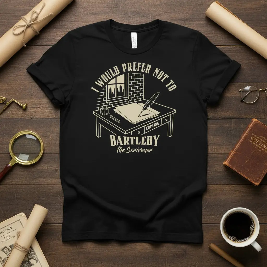 If you’re a fan of Herman Melville or classic American short stories, this “I would prefer not to copying Bartleby the Scrivener” t-shirt is a must-have. It’s a conversation starter that connects you with others who share your literary interests. The design is a subtle yet effective way to showcase your appreciation for literary masterpieces.