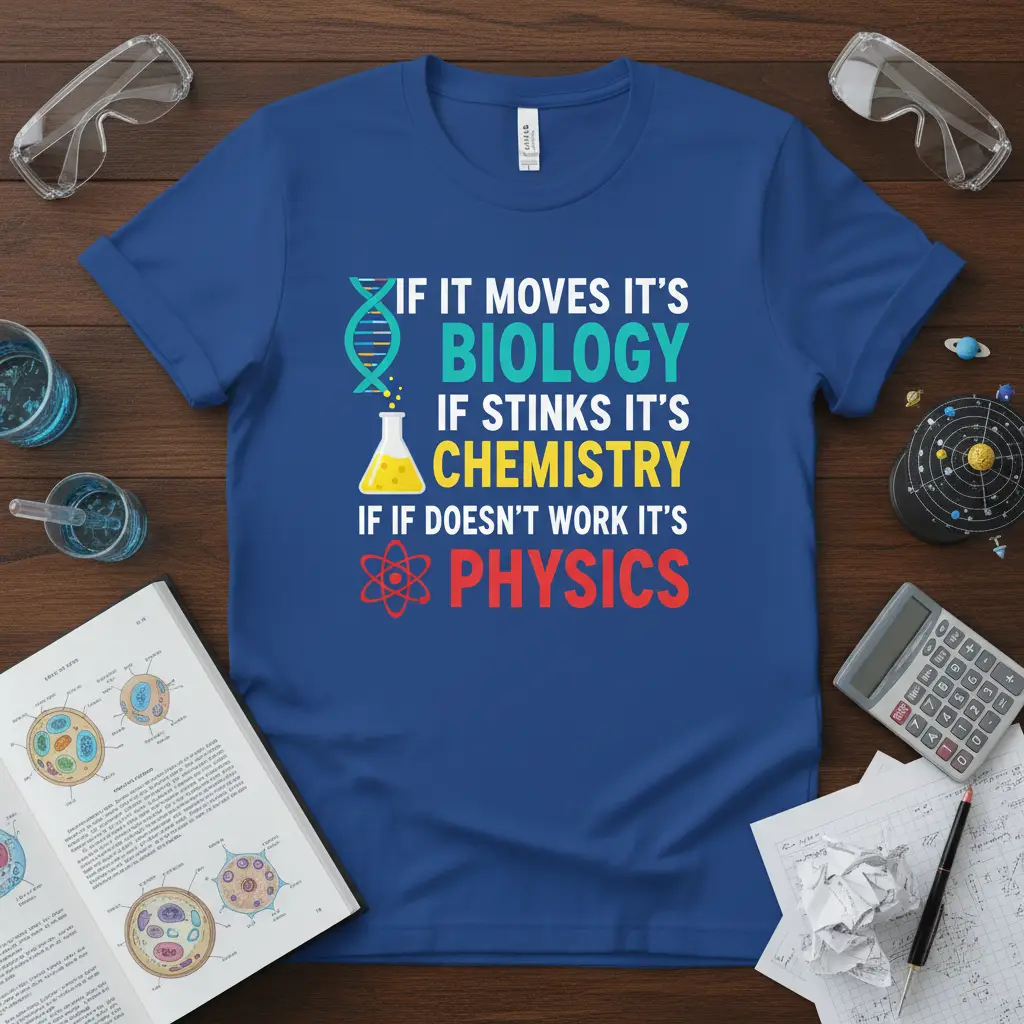 IF IT MOVES IT’S BIOLOGY IF STINKS IT’S CHEMISTRY IF IF DOESN’T WORK IT’S PHYSICS this classic quote tee is designed for the true science enthusiast. This shirt humorously breaks down the fundamental principles of three major scientific fields in a way that is both memorable and relatable. It’s a perfect conversation starter for science teachers, students, and anyone who appreciates the wonders of the universe. Wear your passion for STEM proudly with this unique and witty garment.