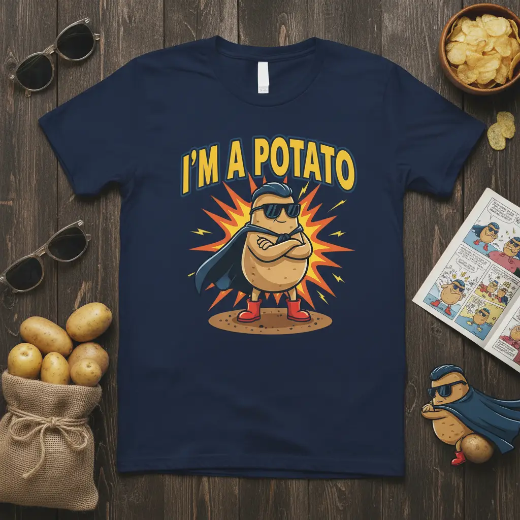 This eye-catching design features a cool, sunglasses-wearing potato hero, complete with a flowing cape and heroic stance. The vibrant yellow text boldly proclaims “I’M A POTATO,” making it impossible to miss. It’s a fun, quirky graphic that perfectly captures the spirit of anyone who loves potatoes and isn’t afraid to show it. The energetic background adds to the superhero vibe, making this tee a standout addition to any casual wardrobe.