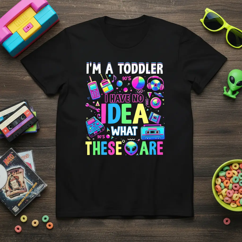 Don’t let this blast from the past slip away! This “I’m A Toddler 90’s I Have No Idea What These Are” t-shirt is more than just clothing; it’s a wearable celebration of a generation’s cherished memories and iconic culture. With its eye-catching retro graphics and witty slogan, it’s guaranteed to become a favorite in your wardrobe. Available in a variety of sizes and colors to ensure a perfect fit and style match for everyone, this tee is ready to bring a touch of 90s fun into your life. Get yours now and let the nostalgia flow!