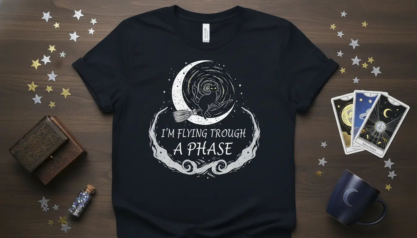 This I’M FLYING TROUGH A PHASE design is not just for everyday wear; it’s also an ideal choice for celebrating spooky season and Halloween. The gothic humor and celestial imagery make it a standout piece for themed parties, trick-or-treating, or simply embracing the eerie atmosphere of autumn. Its versatile design allows you to wear your personality proudly throughout the year.