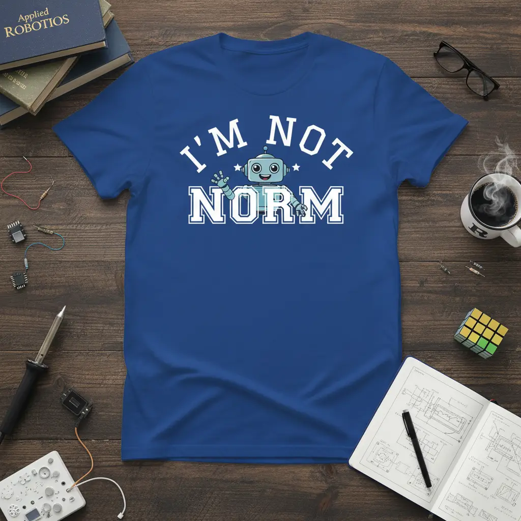 This unique “I’m Not Norm” T-Shirt is designed for those who proudly stand out from the crowd. Featuring a delightful cartoon robot and the declarative phrase “I’M NOT NORM” in a stylish, athletic font, this tee makes a bold statement. It’s the perfect way to showcase your individuality and your appreciation for all things tech and robotic. The design aims to resonate with anyone who doesn’t fit the mold and celebrates their personal quirks and interests with confidence and a touch of humor.