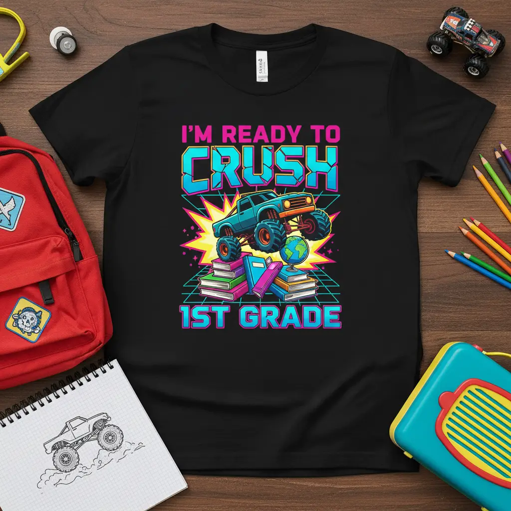 This vibrant t-shirt proudly displays the motivational phrase “I’M READY TO CRUSH 1ST GRADE” in eye-catching, retro-inspired typography. The central graphic features a fierce monster truck positioned dynamically, crushing a stack of books and a globe, symbolizing a powerful approach to learning. The overall design is enhanced with bright colors and energetic bursts, creating an exciting visual that resonates with young students eager to start their academic year.