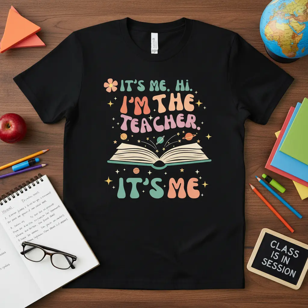 This eye-catching t-shirt proudly displays the phrase “it’s me, hi. I’M THE TEACHER. IT’S ME” in a delightful, retro font. This I’m the Teacher It’s Me design incorporates cheerful elements like flowers, stars, and planets, all centered around an open book, symbolizing the boundless world of knowledge and imagination. This unique combination makes the tee stand out and resonate with anyone passionate about education. It’s designed to bring a smile to the faces of teachers and students alike.
