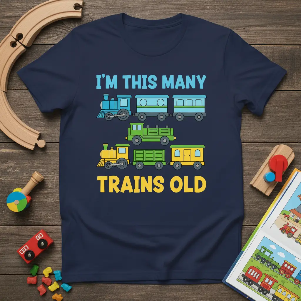This delightful t-shirt captures the excitement of childhood birthdays with its charming “I’m This Many Trains Old” design. It features a vivid display of cartoon trains, from classic steam engines to modern carriages, all rendered in bright, appealing colors. This makes it an ideal choice for toddlers and young children celebrating a milestone age. The graphic is eye-catching and perfectly suited for creating memorable birthday photos.