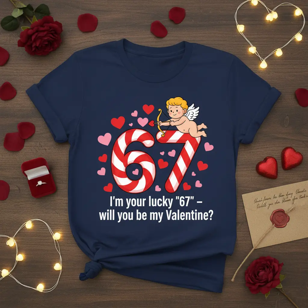 I’m your lucky “67” – will you be my Valentine? This enchanting t-shirt is designed to capture the spirit of romance and playful proposal, making it the ultimate garment for anyone looking to express their love this Valentine’s Day. Featuring a delightful cupid illustration and a unique candy cane-styled number 67, this tee is more than just apparel; it’s a conversation starter and a heartfelt invitation. It’s the perfect way to ask that special question or to celebrate a milestone anniversary with a touch of whimsy and affection. The design is crafted to stand out, ensuring your message of love is seen and felt by your beloved.