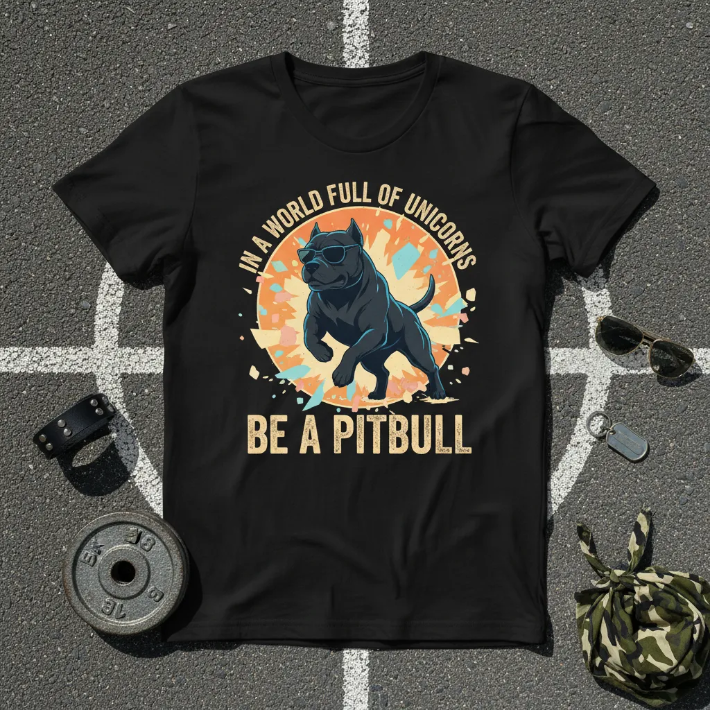 In A World Full Of Unicorns Be A Pitbull, this t-shirt is more than just apparel; it’s a statement of individuality and strength. For those who appreciate the loyalty and character of pitbulls, this design offers a unique way to express your passion. It celebrates the distinctive nature of pitbulls, setting them apart in a world often filled with more whimsical imagery. This tee is designed to resonate with dog lovers who understand and admire the spirit of these powerful yet loving animals.