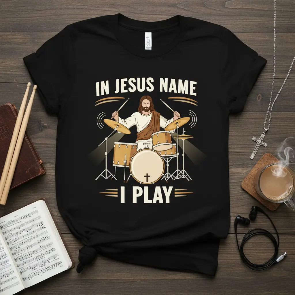 The visual of Jesus playing drums is both unique and inspiring, resonating deeply with drummers who are also followers of Christ. It symbolizes the harmony that can exist between earthly passions and spiritual devotion, encouraging wearers to approach their craft with reverence and dedication. This In Jesus Name I Play design is a conversation starter, a source of encouragement, and a testament to a life lived in faith.