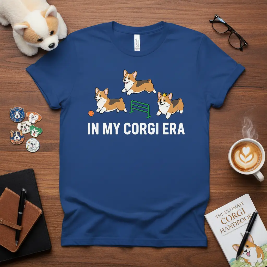 This vibrant blue tee proudly displays the phrase “IN MY CORGI ERA” in crisp white lettering, instantly communicating your devotion. The accompanying playful graphics of three adorable corgis engaging in activities like chasing a ball and jumping over an obstacle add a whimsical touch. This design is meticulously crafted to resonate with corgi owners who understand the unique charm and personality of their pets. It’s the perfect way to showcase your identity as a proud corgi parent.