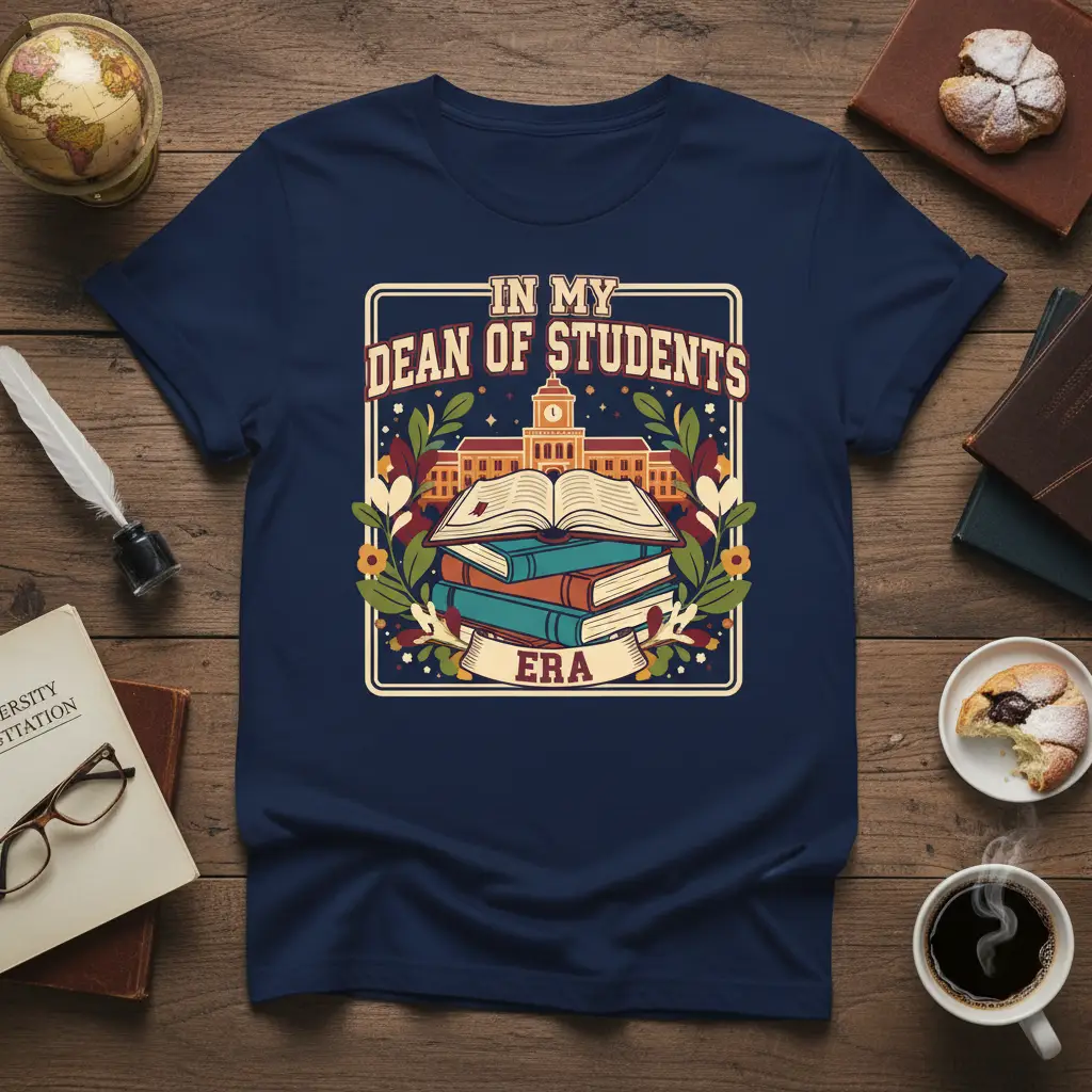 Pick from Black, Navy, Royal, Dark Heather, Red, and White to match your mood and wardrobe staples. Each colorway keeps the In My Dean of Students Era design clear and photo-ready for everyday wear.