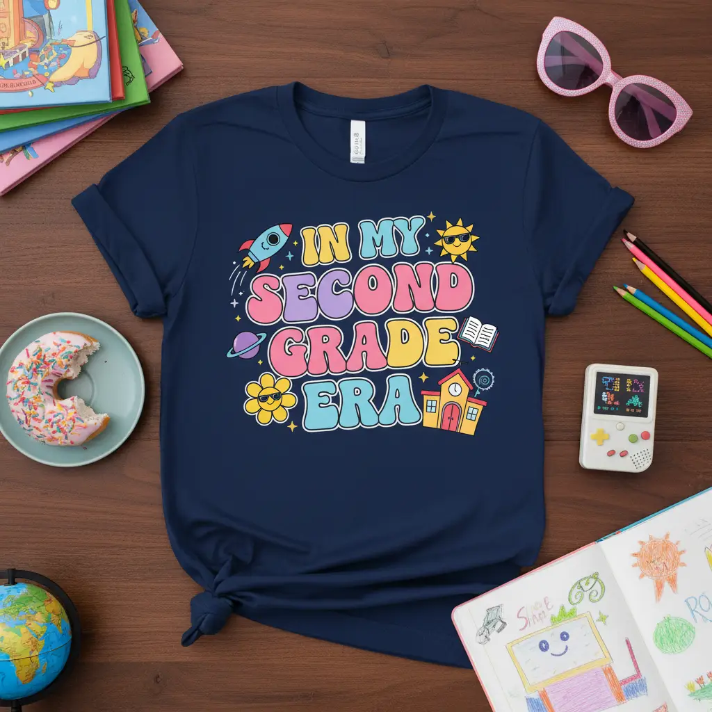 The “In My Second Grade Era” shirt is more than just apparel; it’s a celebration of learning and growth. The combination of educational symbols and whimsical elements creates a balanced design that is both fun and meaningful. This tee is sure to be a hit with students who are excited about their second-grade journey and teachers looking for a way to inject some personality into their classroom attire.