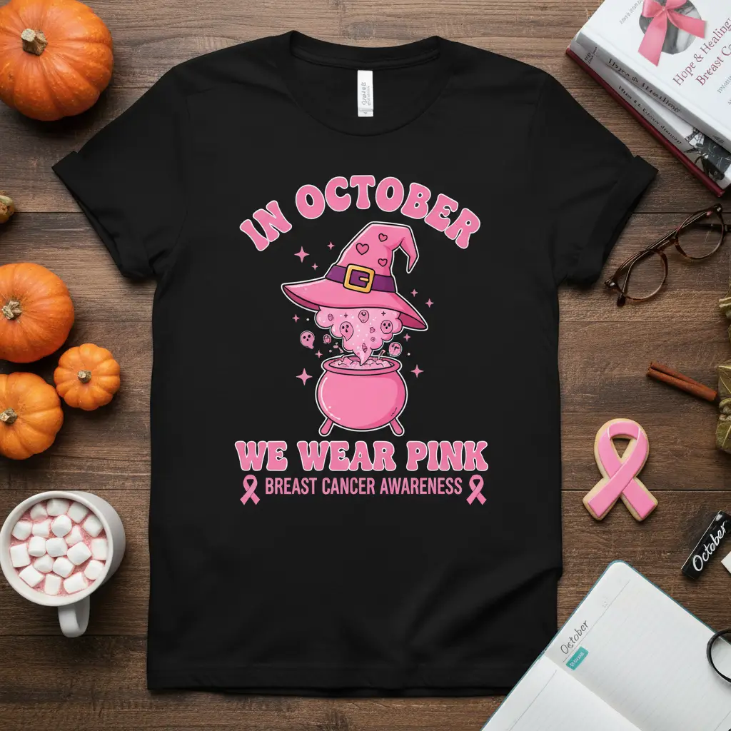 This unique design captures the essence of Breast Cancer Awareness Month with a charming witchy aesthetic. The phrase “In October We Wear Pink” is beautifully rendered, making a clear and impactful statement. It’s a perfect way to blend seasonal fun with a crucial message of support and awareness for breast cancer initiatives. The design aims to be both eye-catching and meaningful.