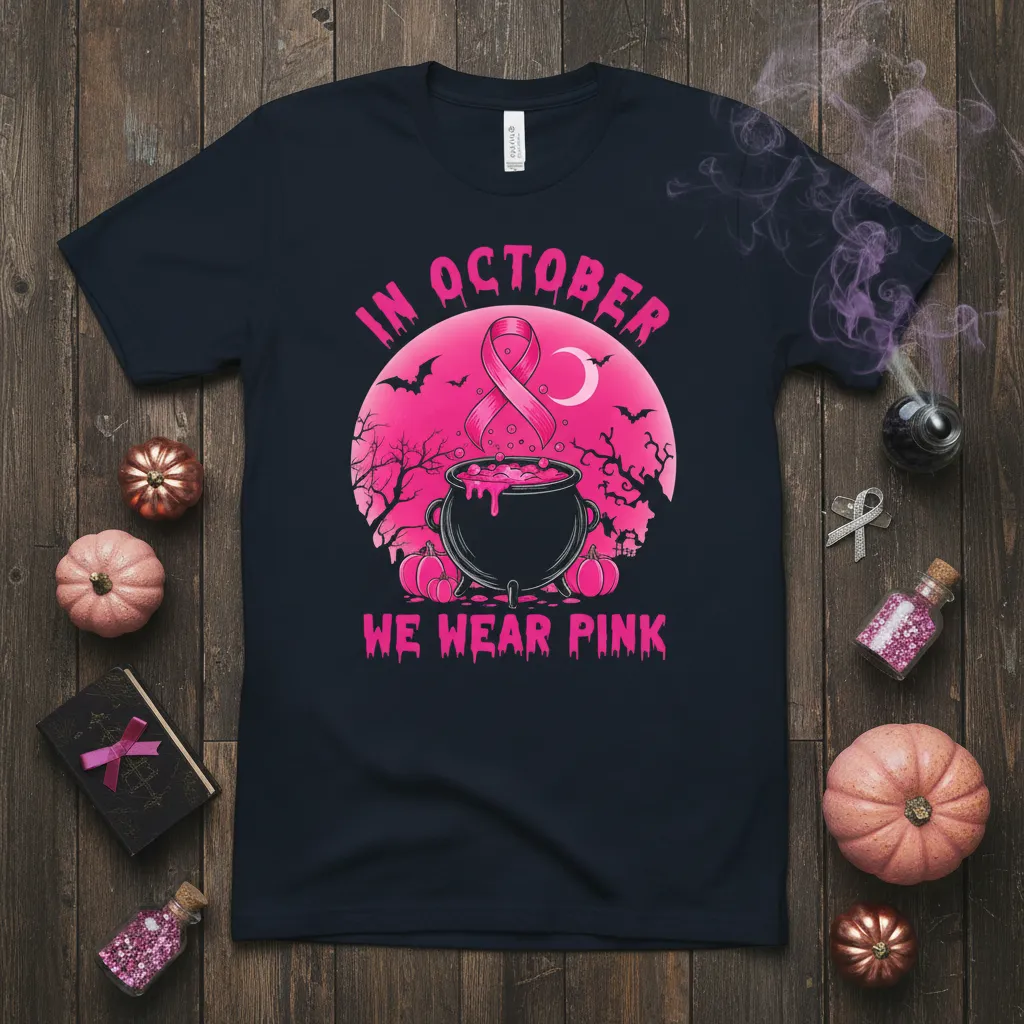 This distinctive t-shirt is more than just apparel; it’s a statement of support and a beacon of hope for breast cancer awareness. The striking visual elements, including a witch’s cauldron, bats, and pumpkins, are creatively integrated with the universally recognized pink ribbon. This In October We Wear Pink design ensures that your message of support is seen and felt, sparking conversations and encouraging unity during this important month. It’s crafted for comfort and durability, making it a perfect choice for events, walks, or everyday wear throughout October and beyond.