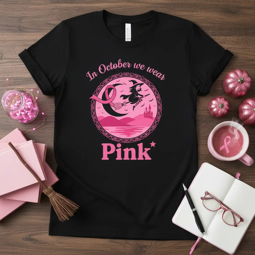 Celebrate breast cancer awareness with the “In October We Wear Pink” T-Shirt. This design features a whimsical witch flying under the moon, embodying strength and hope. Made from comfortable, high-quality fabric, it’s a meaningful way to show your support and spread awareness during October.